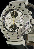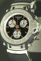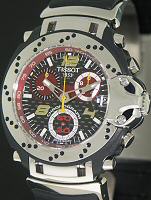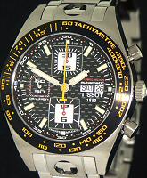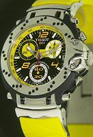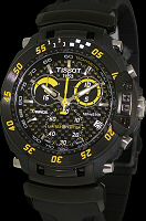 Tissot T90.426.68.3 T-Race MotoGP Limited Edition 2006. Stainless steel and carbon case with brake disc inspired bezel. Eye-catching carbon fiber dial with yellow, red, and white accents. Quartz chronograph with 30 minute, 60 second, and 1/10 second counters. Sporty yellow rubber band. Comes in helmet shaped case with engraved medallions of the 2006 MotoGP season that can be interchanged with the case-back.