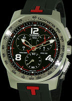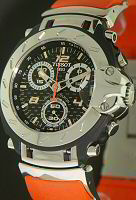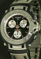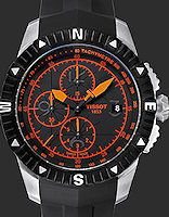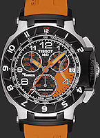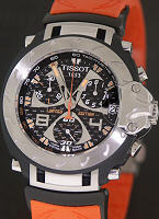 In honor of Tissot signing MotoGP star Nicky Hayden as their latest brand ambassador, this is the Limited Edition Nicky Hayden T-Race quartz chronograph. Stainless Steel and Carbon case with a steel bezel inspired by the vent shafts in brake discs. Carbon fiber dial, orange and white accents, sub dials, and markers, sapphire crystal with date magnifier. Hayden`s number 69 and signature engraved on the back. Bright orange rubber band characteristic of the rising star.