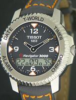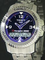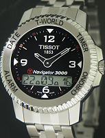 Tissot T-Navigator 3000 from the T-Tactile line. This model is stainless steel with a combination satin and highly polished finished band. Large black dial with white Arabic numerals and markers. Luminous quarter hour markers. Touch sensitive screen operates Alarm, Date, Timer, Chronograph, and 4 time zone view.