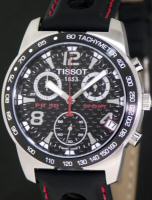 Tissot PR50 Chronograph Nascar T34.1.728.52 quartz chronograph watch. This Special Edition of Nascar official watches extends Tissot PR50 Classic Sport Collection. Black carbon dial with tachymetre scale on black bezel. ETA G10.211 quartz chronograph movement with 1/10 second, 60 second, and 30 minute counters. Sapphire crystal, engraved case back, leather watch strap.