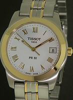 Tissot PR 50 Titanium quartz watch model T34.2.481.13. Satin finished stainless steel case and bracelet with high polish gold plated accents. White dial with gilt hands and markers encased by a sapphire crystal.