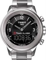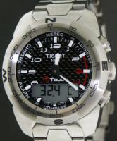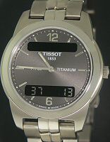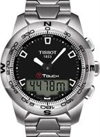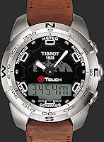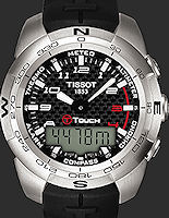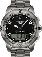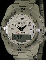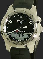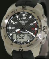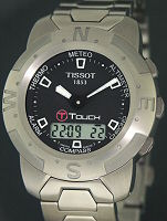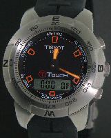 Tissot T-Touch Multi-Function wrist watch. Titanium case and bracelet, sapphire crystal, black dial with white hands and markers. Watch functions activated by pressing on the crown plus touch-sensitive screen. T-Touch functions: Altimeter, Chronograph, Compass, Alarm, Thermometer, Barometer, Date and Time.