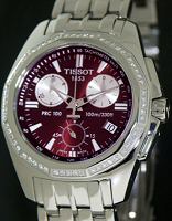 Tissot ladies quartz sport-dress chronograph model with gorgeous deep burgundy color dial and silver sub-dials, diamond studded bezel, 100m water resistance, polished stainless steel case and bracelet