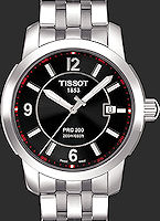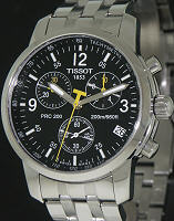 Tissot PRC200 T17.1.586.52 chronograph quartz. Sleek designed highly polished stainless steel case with two raised satin finish strips on each side. ETA G10.211 quartz chronograph movement 1/10 second, 60 second, and 30 minute registers. Black dial with guilloche finished black sub dials. Contrasting yellow chronograph hands. Luminous hands and markers. Sapphire crystal. Stainless steel watch bracelet with deployant buckle.