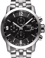 Tissot PRS200 T067.417.21.051.00 chronograph quartz watch. Swiss ETA G10.211 quartz chronograph movement with 1/10 second, 60 second, and 30 minute counters. Stainless steel case and band. Black 0-60 bezel. Black dial and sub dials. Sapphire crystal.