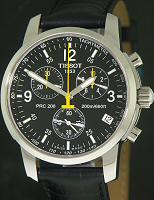 Tissot PRC200 T17.1.526.52 chronograph quartz. Sleek designed highly polished stainless steel case with two raised satin finish strips on each side. ETA G10.211 quartz chronograph movement 1/10 second, 60 second, and 30 minute registers. Black dial with guilloche finished black sub dials. Contrasting yellow chronograph hands. Luminous hands and markers. Sapphire crystal. Black alligator print genuine leather band with deployant buckle.