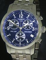 Tissot PRC200 quartz chronograph model T17.1.586.42. ETA quartz chronograph movement with 1/10 second, 60 second, and 30 minute registers. Unique high polish stainless steel casing with satin finish raised inserts on each side. Deep blue dial with guilloche sub dials. Hands and markers are luminous filled for awesome night viewing. Combination satin and high polish stainless steel bracelet. 200m water resistant with screw down crown and case back.