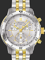 Tissot PRS200 T067.417.22.031.00 chronograph quartz watch. Swiss ETA G10.211 quartz chronograph movement with 1/10 second, 60 second, and 30 minute counters. Stainless steel case and bracelet with gold tone accents. 0-60 bezel. Silver dial and sub dials. Sapphire crystal.