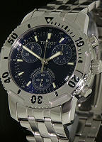 Tissot T19.1.495.51 Seastar Diver 660 quartz chronograph. Perfect for diving, with a black filled unidirectional black filled bezel. Luminous hands and markers contrast nicely to the black dial. Swiss ETA G10.211 quartz chronograph movement with 1/10 second, 60 second, and 30 minute counters. Date display window. This watch is on a rubber strap with a safety clasp and over-the-wetsuit diver extension. Stainless steel case, 200m water resistancy, and sapphire crystal allow for extreme durability.