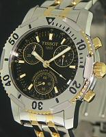 Tissot PRS200 T17.2.486.55 two-tone chronograph quartz watch. Swiss ETA G10.211 quartz chronograph movement with 1/10 second, 60 second, and 30 minute counters. Combination finish satin and high polish, stainless steel with gold plated accents on bezel case and band. Crown and pushers are gold plated. Gold plated fluted edge on bezel with brushed cutouts...very unusual. Black dial and sub dials with contrasting luminous filled gold color hands and markers. sapphire crystal.