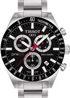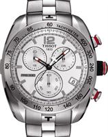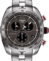 Tissot T-Sport PRS516 quartz chronograph model T0444172103100. Black PVD coated bezel with tachymeter scale to delight all driving enthusiasts! Silver color dial. Stainless steel case and bracelet. 100 meters water resistant