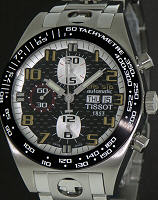 Tissot T91.1.487.81 PRS516 Automatic Chronograph. This sporty watch uses an ETA Valjoux 7750 movement. Features include day, date, and 60 second, 30 minute, 12 hour registers. Black PVD coated bezel has bright yellow filled tachymeter scale to delight all driving enthusiasts! Great carbon fiber dial is accented with reds, yellows, and whites. Combination high polish and satin finish stainless steel case and bracelet. In raceworthy style, the band has holes cut out in the links and two "T"s cut on each side where it connects to the case. Luminous hands and markers for night visibility. Steering wheel style case back with see-through window.