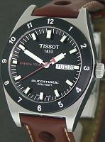 Tissot PRS 516 Automatic wrist watch. 25 jewels Swiss ETA 2836-2 Automatic movement, sapphire crystal, stainless steel case with black color bezel and observation case back, day/date calendar, black dial with luminous hands and markers, brown leather watch band.