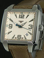 Tissot Quadrato stainless steel watch model T005.510.16.267.00 powered by quartz movement with date calendar. Rectangular case, sapphire crystal ivory dial with texture. Blue seconds hand. Light brown watch strap with center opening clasp. Water resistant to 100 meters