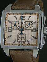 Tissot Quadrato stainless steel chronograph watch model T005.517.16.267.00 powered by Swiss quartz movement with date calendar. Rectangular case, ivory color dial with texture. Sapphire crystal. Blue seconds hand. Light brown leather watch band with center opening clasp. Water resistant to 100 meters