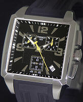 Tissot Quadrato stainless steel chronograph watch model T005.517.17.057.00 powered by Swiss quartz movement with date calendar. Rectangular case, black dial with texture. Sapphire crystal. Yellow seconds hand. Black rubber watch band with tri-fold clasp and spring release. Water resistant to 100 meters