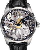 Tissot T-Complication Squelette watch model T070.405.16.411.00. Swiss mechanical hand-wound movement. Stainless steel case with skeleton see-through dial. Sapphire crystal. Black leather watch band.