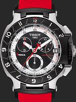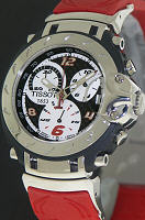 Tissot T-Race MotoGP Limited Edition 2007 quartz chronograph. Sporty carbon fiber dial with red accents, white sub-dials, red patterned. Limited to 7002 pieces. Comes with miniature riders helmet with Tissot and MotoGP logos and a set of interchangeable case-backs, each one represents a different MotoGP track around the world.