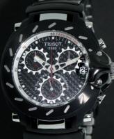 Tissot T90.4.296.84 T-Race MotoGP. Stainless steel and carbon case with brake disc inspired bezel. Eye-catching black carbon fiber dial with red, yellow, and white accents. Quartz chronograph with 30 minute, 60 second, and 1/10 second counters. Sporty black rubber band. Sapphire crystal with date magnifier.