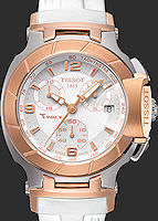 Tissot T-Race Lady model T048.217.27.017.00. Stainless steel case with gold plated accents. Swiss quartz chronograph. movement. White dial. Sapphire crystal. White rubber band. 100 meters water resistant