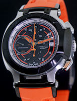 Tissot T90.4.496.51 T-Race Stainless Steel and Carbon case with braking disc inspired decorative bezel and attachment to black rubber band. Black dial with Orange markers and silver sub-dials make for a very sharp dial. Sapphire crystal with half circle raised date magnifier. 1/10 second, 60 second, and 30 minute registers on chronograph quartz with add and split functions.