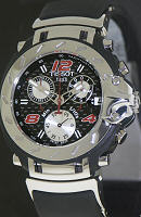 In honor of Tissot brand ambassador Nicky Hayden the MotoGP World Champion. This is the 2010 Limited Edition Nicky Hayden T-Race quartz chronograph. Stainless Steel case with a steel black PVD plated bezel. Black and white dial, sapphire crystal with date magnifier. Red rubber starp