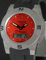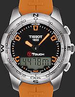 Tissot T-Touch II Multi-Function wrist watch. Stainless steel case, sapphire crystal, black dial with orange hands and markers. Orange rubber band. Watch functions activated by pressing on the crown plus touch-sensitive screen. T-Touch functions: Altimeter, Chronograph, Compass, Alarm, Thermometer, Barometer, Date and Time.