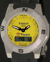 Tissot T-Touch Trekking Multi-Function wrist watch. Titanium case, sapphire crystal, yellow dial with luminous hands and markers, black rubber watch band. Watch functions operated by touch-sensitive screen which is activated by the crown. T-Touch functions: Altimeter, Chronograph, Compass, Alarm, Thermometer, Barometer, Date and Time.