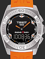 Tissot Racing-Touch Multi-Function wrist watch model T002.520.17.051.01. Stainless steel case, sapphire crystal, black dial with luminous hands and markers, orange rubber watch band. Watch functions operated by touch-sensitive screen which is activated by the crown. T-Touch functions: Tide schedule, Lap chronograph, Split chronograph, Compass, Alarm, Timer/countdown, Date and Time.