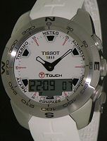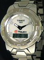 Tissot T-Touch "Expert" 100m water resistant, stainless steel case and band. Altimeter, barometer,compass, 2 alarms, dual time, stopwatch, countdown timer,thermometer. Sapphire crystal, silver color dial with Arabic numbers.