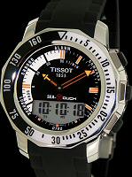 Tissot Sea-Touch Diver model T026.420.17.281.01. Features compass, thermometer, second time zone, alarm, stopwatch, dive assistant, and logbook. Solid stainless steel case and bezel. Sapphire crystal. Comes on a black rubber band with deployment clasp.