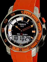 Tissot Sea-Touch Diver model T026.420.17.281.03. Features compass, thermometer, second time zone, alarm, stopwatch, dive assistant, and logbook. Solid stainless steel case and bezel. Black dial with orange accents. Sapphire crystal. Comes on an orange rubber band with divers deployment clasp.