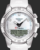 Tissot T-Touch II Lady Multi-Function wrist watch. Titanium case, sapphire crystal, white Mother-of Pearl dial with black hands, white rubber watch band. Watch functions activated by pressing on the crown plus touch-sensitive screen. T-Touch functions: Altimeter, Chronograph, Compass, Alarm, Thermometer, Barometer, Date and Time.