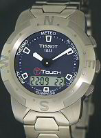 Tissot T-Touch Multi-Function wrist watch. Titanium case and bracelet, sapphire crystal, blue dial with luminous hands and markers. Watch functions activated by pressing on the crown plus touch-sensitive screen. T-Touch functions: Altimeter, Chronograph, Compass, Alarm, Thermometer, Barometer, Date and Time.