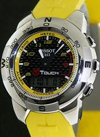 Tissot T-Touch Multi-Function NASCAR Special Edition watch. Titanium case, yellow silicone watch strap, sapphire crystal with anti-glare coating, black carbon fiber dial with white Arabic numerals, luminescent filled markers, black hands. Watch functions operated by touch-sensitive screen which is activated by the crown. T-Touch functions: Altimeter, Chronograph, Compass, Alarm, Thermometer, Barometer, Date and Time.