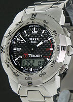 Tissot T-Touch "Expert" 100m water resistant, titanium case and band, carbon fiber dial. Altimeter, borometer,compass, 2 alarms, dual time, stopwatch, countdown timer,thermometer, sapphire crystal, black carbon dial with Arabic numbers.