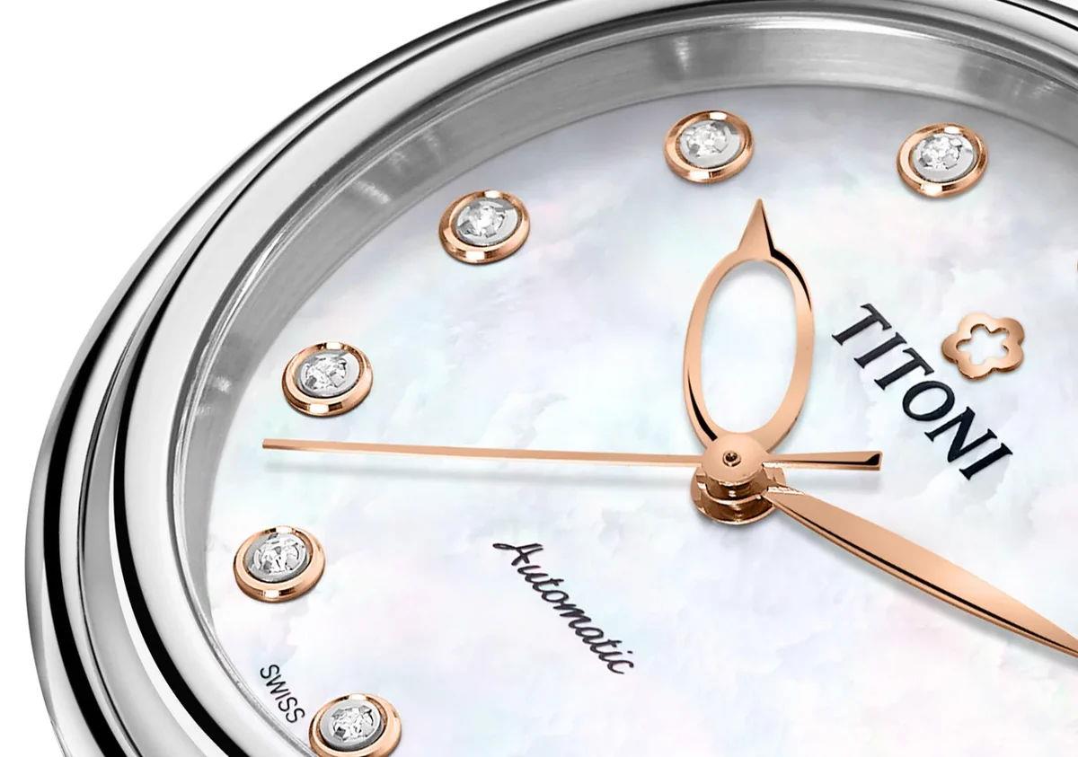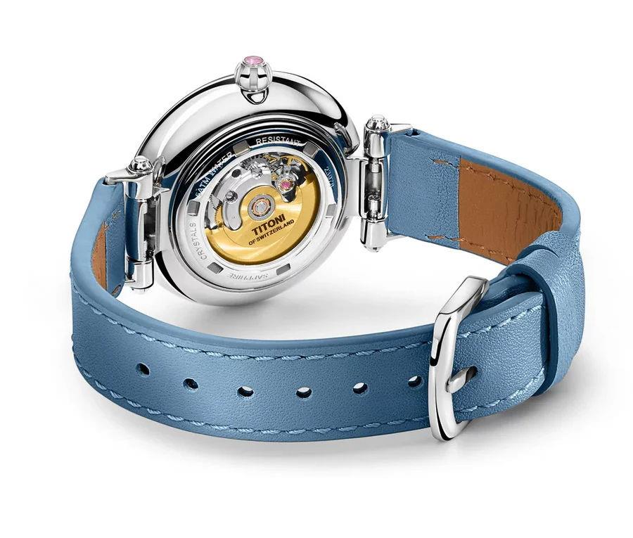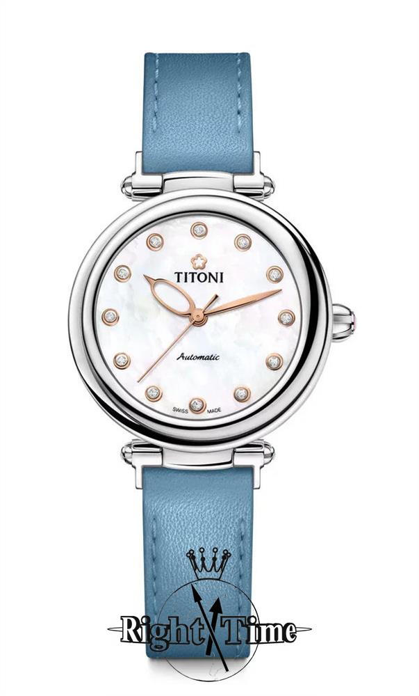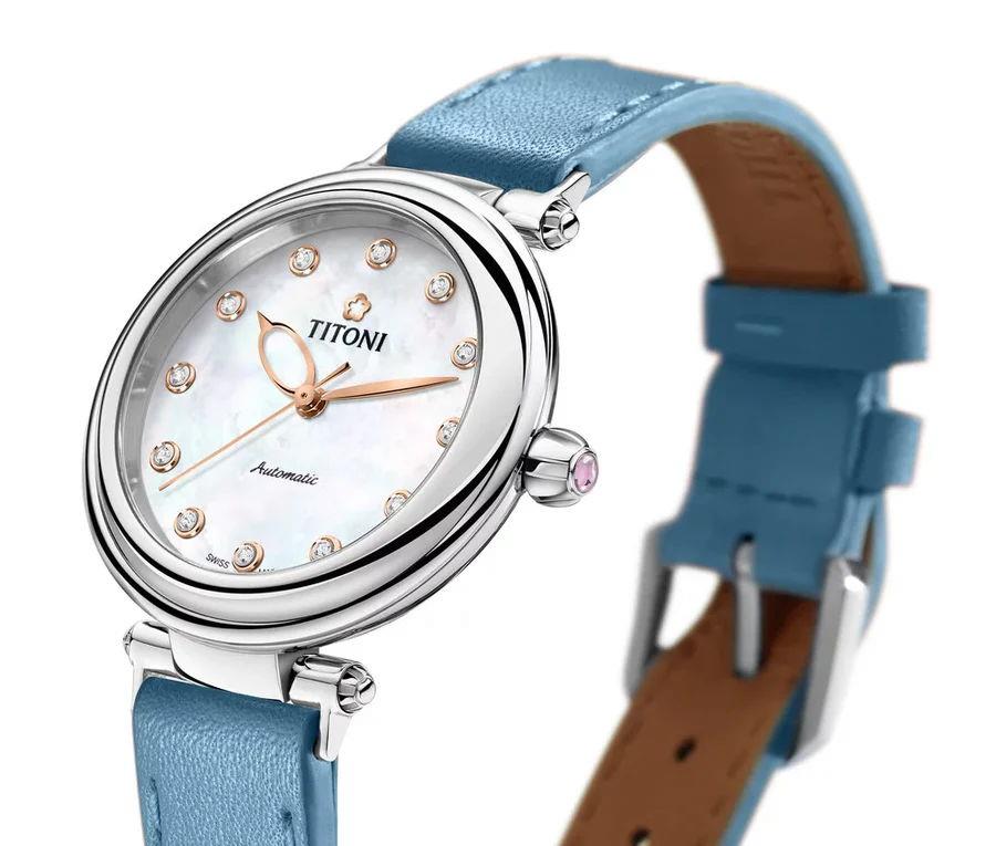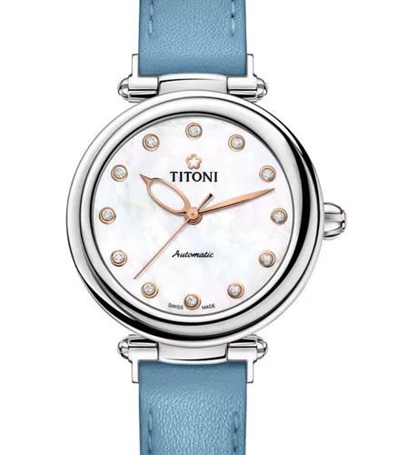 Titoni Miss Lovely Collection. Model 23978 S-STS-622. 33.5mm stainless steel case with blue leather strap. Powered by Swiss automatic movement. Sapphire crystal. White Mother-of-Pearl dial with diamond markers. 50 meters water resistant
