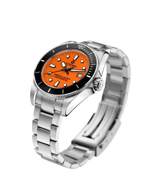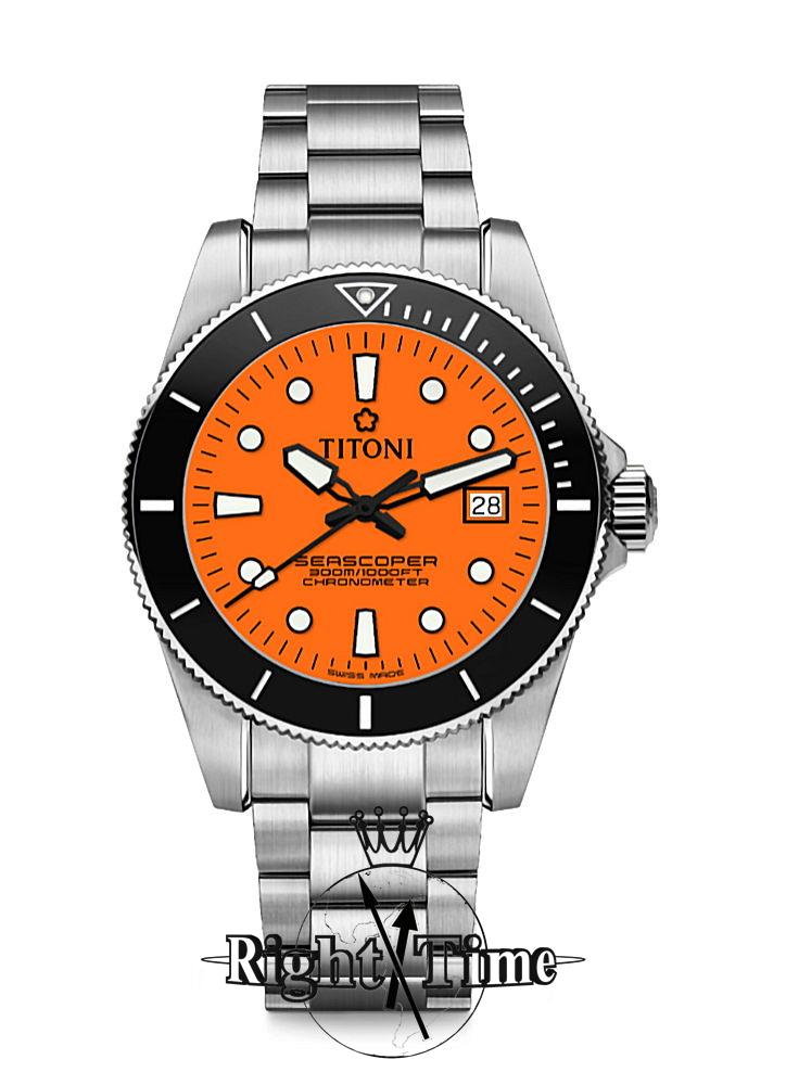 Titoni Seascoper. Model 83300 S-BK-715. 42mm stainless steel case with bracelet. Powered by Swiss automatic chronometer movement. Sapphire crystal. Orange color dial with date calendar. 300 meters water resistant