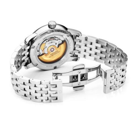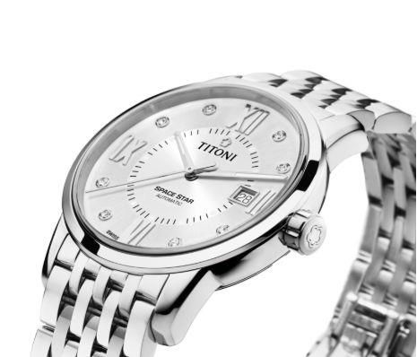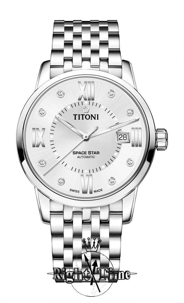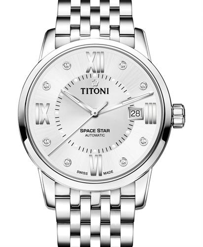 Titoni Space Star Collection. Model 83538 S-099. 40 mm stainless steel case with bracelet. Powered by Swiss automatic movement with date calendar. Sapphire crystal. Silver color dial with Roman numerals and cubic stones. 50 meters water resistant