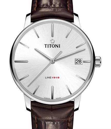 Titoni Line 1919 Collection. Model 83919 S-ST-575. 40mm stainless steel case with brown leather band. Powered by Titoni`s first ever self-developed and manufactured movement the T10 caliber automatic. Sapphire crystal. Silver color dial with date calendar. 50 meters water resistant