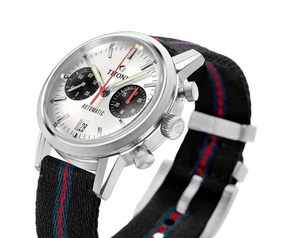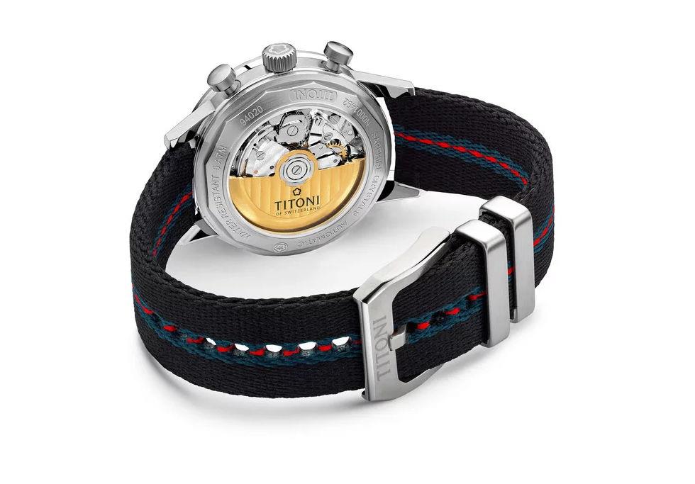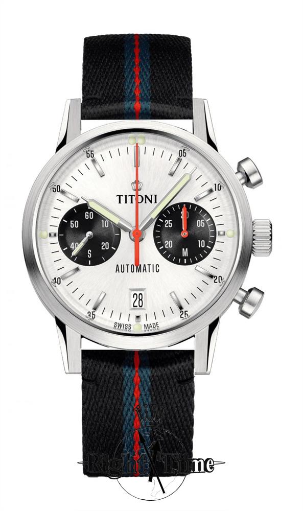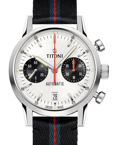 Titoni Heritage Collection. Model 94020 S-T4-680. 41mm stainless steel case with textile strap. Powered by Swiss automatic Sellita SW510BHa chronograph movement. Sapphire crystal. Silver color dial with black sub-dials and date calendar. 50 meters water resistant