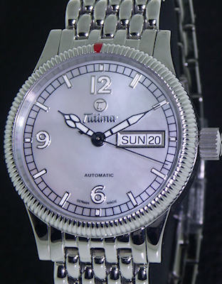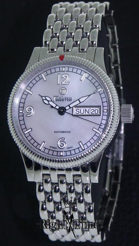 Tutima Grand Classic ladies automatic wrist watch model 610-02. ETA Cal. 2836-2 Swiss Automatic movement with day/date calendar. Polished stainless steel 36mm case with bi-directional coin edge style rotating bezel, screw-down crown and skeleton case back. Mother of pearl dial with Arabic numerals and luminous hands.