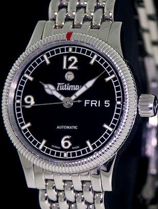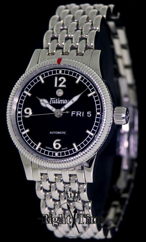 Ladies 36mm Tutima Grand Classic automatic wrist watch model 610-04. ETA Cal. 2836-2 Swiss Automatic movement with day/date calendar. Highly polished stainless steel case with bi-directional coin edge style rotating bezel, screw-down crown and skeleton case back. Black dial with Arabic numerals and luminous hands. Highli polished and the most comfortable steel bracelet