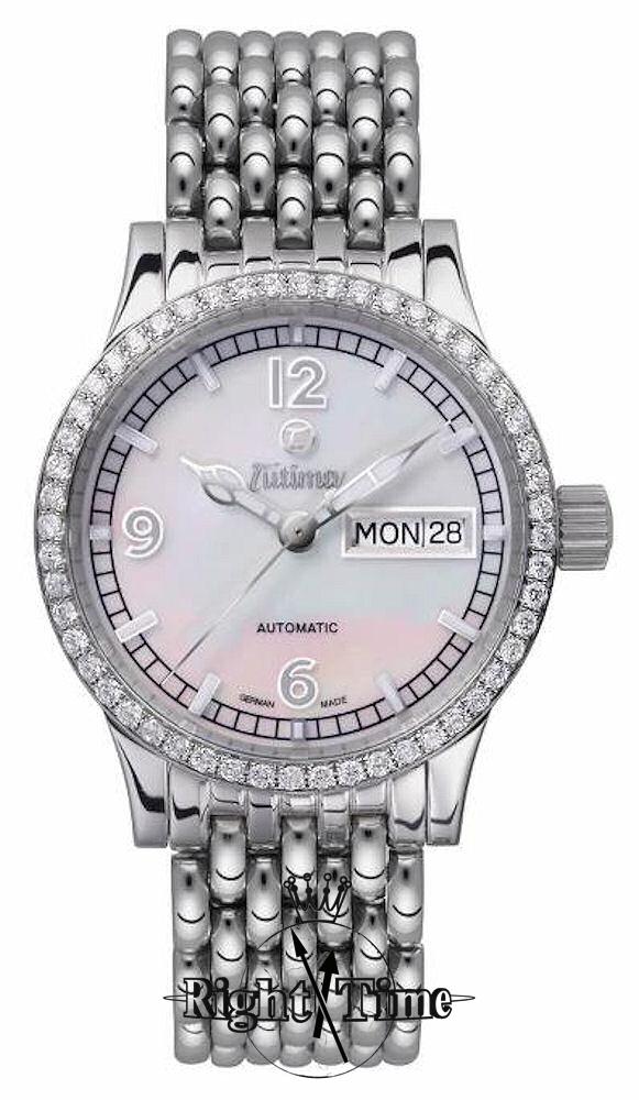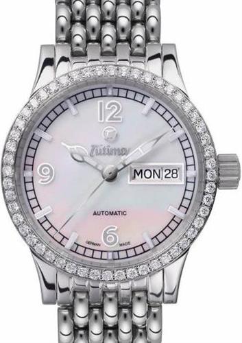 Tutima Grand Classic ladies automatic wrist watch model 610-22. ETA Cal. 2836-2 Swiss Automatic movement with day/date calendar. Polished stainless steel 36mm case with 52 diamonds on the bezel, screw-down crown and skeleton case back. Mother of pearl dial with Arabic numerals and luminous hands.