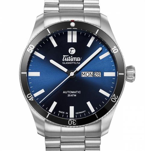 Tutima Glashutte Grand Flieger Airport Automatic wrist watch model 6101-04. Automatic movement Cal. Tutima 330 with day/date calendar. Stainless steel case with black bi-directional rotating 0-60 bezel, screw-down crown and skeleton case back. Sapphire crystal on front and back. Blue dial with luminous hands and large markers. Water resistant to 200 meters.