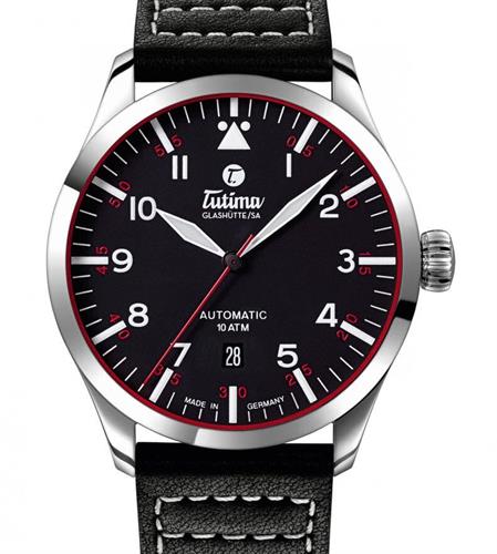 Tutima Glashutte Grand Flieger Classic Automatic wrist watch model 6105-01. Automatic movement Cal. Tutima 330 with date calendar. Stainless steel case. Sapphire crystal on front and back. Black dial with red outer ring, luminous hands and Arabic numerals. Black leather strap. Water resistant to 100 meters.