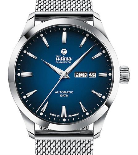 Tutima Glashutte Sky Automatic wrist watch model 6105-22. Automatic movement Cal. Tutima 330 with day/date calendar. Stainless steel case with mesh bracelet, screw-down crown and skeleton case back. Sapphire crystal on front and back. Blue dial with luminous hands and markers. Water resistant to 100 meters.