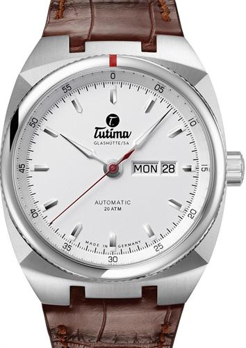 Tutima Glashutte Saxon One Automatic wrist watch model 6120-04. Automatic movement Cal. Tutima 330 with day/date calendar. Stainless steel case with the three-dimensional, pyramid-shaped design, bi-directional rotating bezel, screw-down crown and skeleton case back. Sapphire crystal on front and back. White opalin dial with luminous hands and markers. Brow Alligator leather strap with folding clasp. Water resistant to 200 meters.