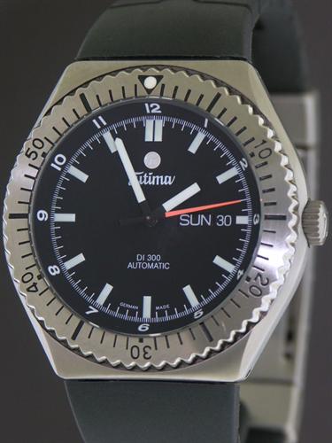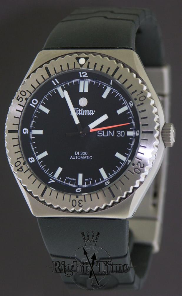 Tutima divers DI300 titanium case and rubber strap model 629-01 powered by ETA Cal. 2836-2 25 jewels Swiss Automatic movement with Day/Date calendar, flat black dial.