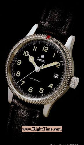 Tutima Flieger Automatic wrist watch. ETA Cal. 2892-2 Swiss Automatic movement with date calendar. Stainless steel case with bi-directional coin edge style rotating bezel and screw-down crown. Black dial with luminous hands and Arabic numerals. Black leather watch band. Available with metal bracelet.